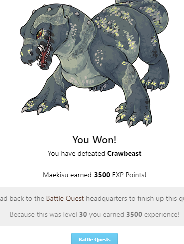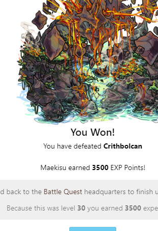 You Won! You have defeated Unstable Snow Fairy Batpod earned 3500 EXP Points! Head back to the Battle Quest headquarters to finish up this quest! Because this was level 30 you earned 3500 experience!