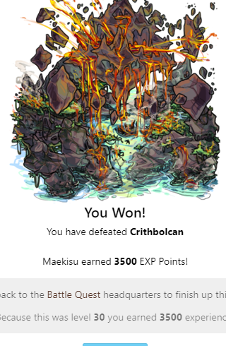 You Won! You have defeated Crithbolcan You won a(n) Impossible token to use in the battle shop! Batpod earned 3500 EXP Points! Head back to the Battle Quest headquarters to finish up this quest! Because this was level 30 you earned 3500 experience!