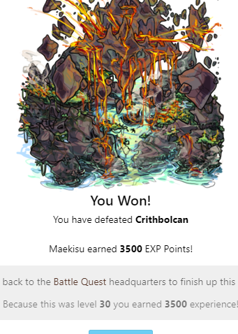Maekisu earned 3500 EXP Points! Head back to the Battle Quest headquarters to finish up this quest! Because this was level 30 you earned 3500 experience!