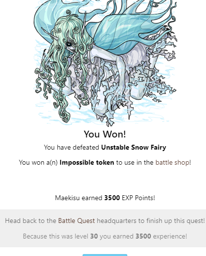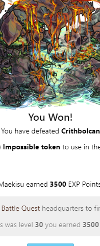 You Won! You have defeated Crithbolcan You won a(n) Impossible token to use in the battle shop! Batpod earned 3500 EXP Points! Head back to the Battle Quest headquarters to finish up this quest! Because this was level 30 you earned 3500 experience!