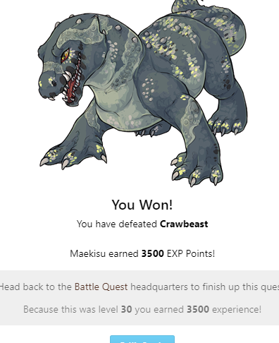 You Won! You have defeated Crawbeast You won a(n) Impossible token to use in the battle shop! Verdugo earned 3500 EXP Points! Head back to the Battle Quest headquarters to finish up this quest! Because this was level 30 you earned 3500 experience!