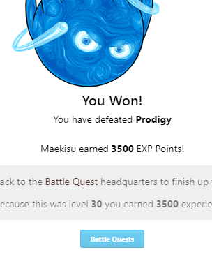 You Won! You have defeated Prodigy Verdugo earned 3500 EXP Points! Head back to the Battle Quest headquarters to finish up this quest! Because this was level 30 you earned 3500 experience!