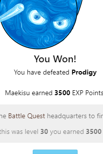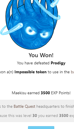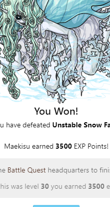 You Won! You have defeated Unstable Snow Fairy You won a(n) Impossible token to use in the battle shop! Verdugo earned 3500 EXP Points! Head back to the Battle Quest headquarters to finish up this quest! Because this was level 30 you earned 3500 experience!