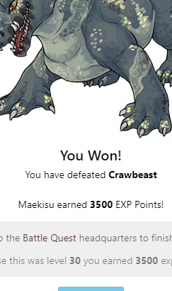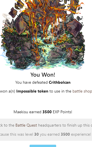 You Won! You have defeated Crithbolcan You won a(n) Impossible token to use in the battle shop! Batpod earned 3500 EXP Points! Head back to the Battle Quest headquarters to finish up this quest! Because this was level 30 you earned 3500 experience!
