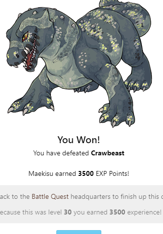 You Won! You have defeated Crawbeast You won a(n) Impossible token to use in the battle shop! Batpod earned 3500 EXP Points! Head back to the Battle Quest headquarters to finish up this quest! Because this was level 30 you earned 3500 experience!