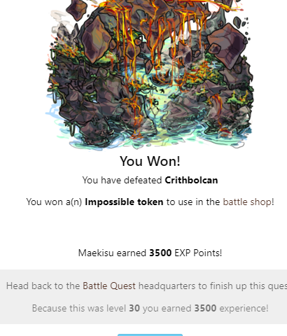 You Won! You have defeated Crithbolcan You won a(n) Impossible token to use in the battle shop! Elyviia earned 3500 EXP Points! Head back to the Battle Quest headquarters to finish up this quest! Because this was level 30 you earned 3500 experience!