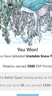You Won! You have defeated Unstable Snow Fairy Elyviia earned 3500 EXP Points! Head back to the Battle Quest headquarters to finish up this quest! Because this was level 30 you earned 3500 experience!