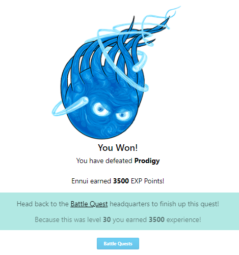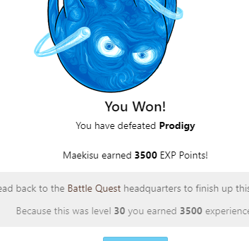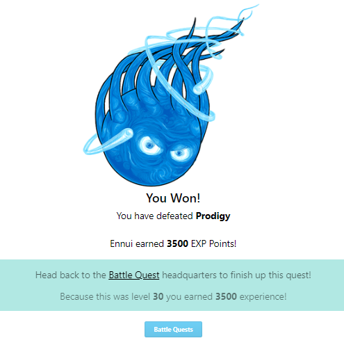 You Won! You have defeated Prodigy Batpod earned 3500 EXP Points! Head back to the Battle Quest headquarters to finish up this quest! Because this was level 30 you earned 3500 experience!