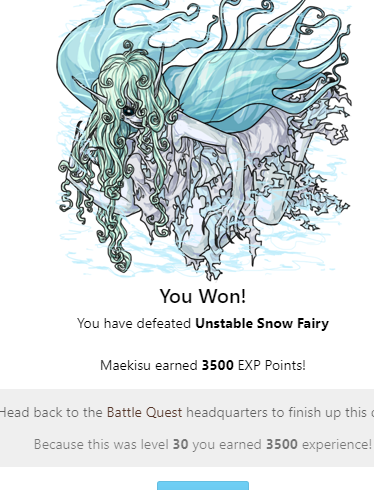 You Won! You have defeated Unstable Snow Fairy Verdugo earned 3500 EXP Points! Head back to the Battle Quest headquarters to finish up this quest! Because this was level 30 you earned 3500 experience!