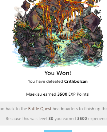 You Won! You have defeated Crithbolcan Verdugo earned 3500 EXP Points! Head back to the Battle Quest headquarters to finish up this quest! Because this was level 30 you earned 3500 experience!