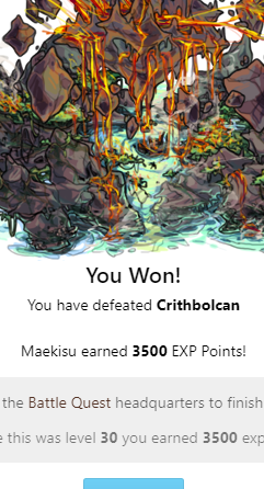 You Won! You have defeated Crithbolcan Elyviia earned 3500 EXP Points! Head back to the Battle Quest headquarters to finish up this quest! Because this was level 30 you earned 3500 experience!