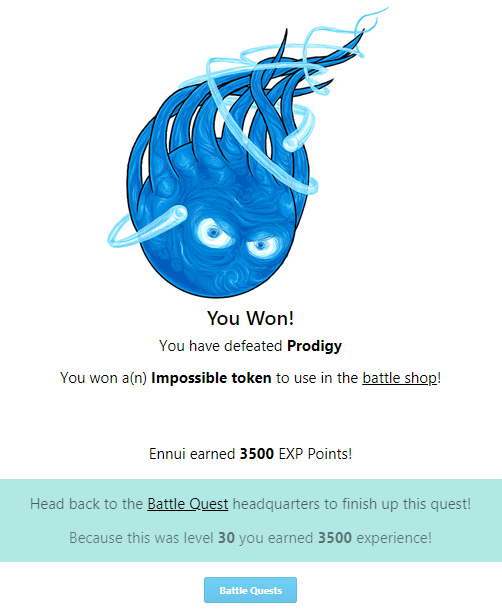 You Won! You have defeated Prodigy Verdugo earned 3500 EXP Points! Head back to the Battle Quest headquarters to finish up this quest! Because this was level 30 you earned 3500 experience!
