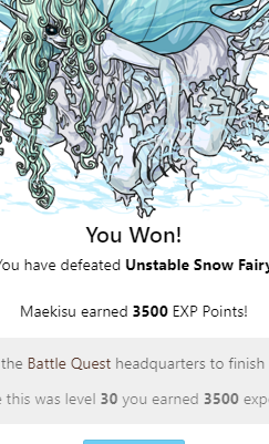 You Won! You have defeated Unstable Snow Fairy You won a(n) Impossible token to use in the battle shop! Elyviia earned 3500 EXP Points! Head back to the Battle Quest headquarters to finish up this quest! Because this was level 30 you earned 3500 experience!