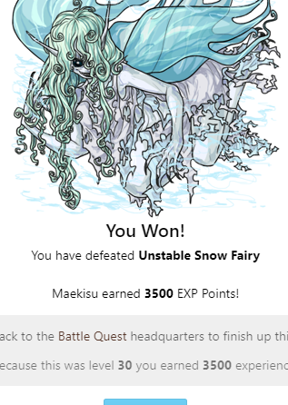 You Won! You have defeated Unstable Snow Fairy Chocolaterie earned 3500 EXP Points! Head back to the Battle Quest headquarters to finish up this quest! Because this was level 30 you earned 3500 experience!