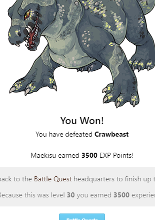 You Won! You have defeated Crawbeast widowmaker earned 3500 EXP Points! Head back to the Battle Quest headquarters to finish up this quest! Because this was level 30 you earned 3500 experience!