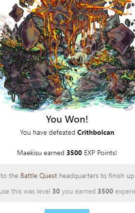 You Won! You have defeated Crithbolcan widowmaker earned 3500 EXP Points! Head back to the Battle Quest headquarters to finish up this quest! Because this was level 30 you earned 3500 experience!