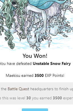 You Won! You have defeated Unstable Snow Fairy You won a(n) Impossible token to use in the battle shop! Batpod earned 3500 EXP Points! Head back to the Battle Quest headquarters to finish up this quest! Because this was level 30 you earned 3500 experience!