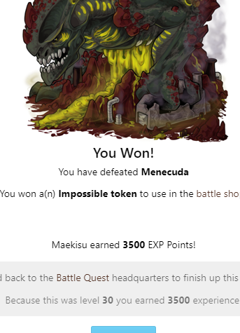 You Won! You have defeated Menecuda Oranos earned 3500 EXP Points! Head back to the Battle Quest headquarters to finish up this quest! Because this was level 30 you earned 3500 experience!