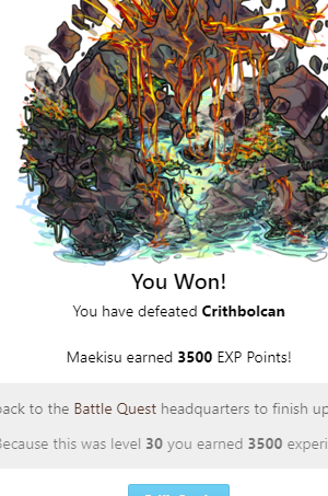 You Won! You have defeated Crithbolcan Vinoc earned 3500 EXP Points! Head back to the Battle Quest headquarters to finish up this quest! Because this was level 30 you earned 3500 experience!