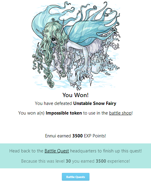 You Won! You have defeated Unstable Snow Fairy widowmaker earned 3500 EXP Points! Head back to the Battle Quest headquarters to finish up this quest! Because this was level 30 you earned 3500 experience! Battle Quests