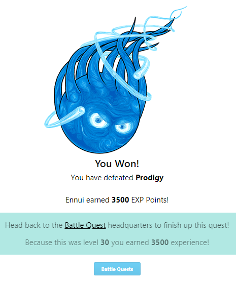 You Won! You have defeated Prodigy widowmaker earned 3500 EXP Points! Head back to the Battle Quest headquarters to finish up this quest! Because this was level 30 you earned 3500 experience!