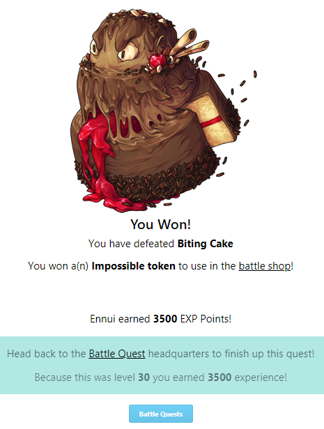 Chocolaterie earned 3500 EXP Points! Head back to the Battle Quest headquarters to finish up this quest! Because this was level 30 you earned 3500 experience!
