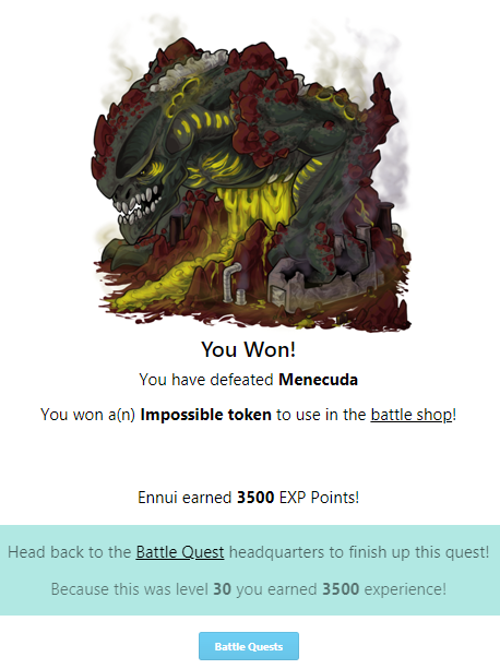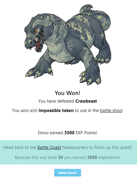 You Won! You have defeated Crawbeast You won a(n) Impossible token to use in the battle shop! widowmaker earned 3500 EXP Points! Head back to the Battle Quest headquarters to finish up this quest! Because this was level 30 you earned 3500 experience!