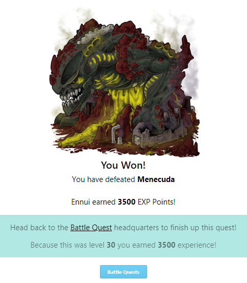 You Won! You have defeated Crawbeast widowmaker earned 3500 EXP Points! Head back to the Battle Quest headquarters to finish up this quest! Because this was level 30 you earned 3500 experience!
