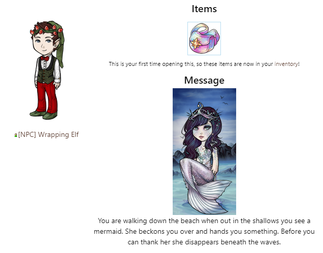 "You are walking down the beach when out in the shallows you see a mermaid. She beckons you over and hands you something. Before you can thank her she disappears beneath the waves."