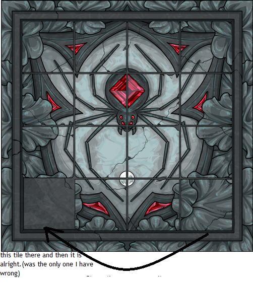 It is spider and has eight legs line the legs up and that might help .... the top has legs pointing up the next row has the large gem the next row has the white body and the last row has the legs pointing down. Follow the shape of the legs.