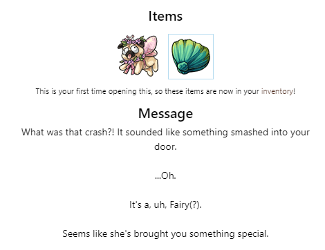 TTOTT Edit; Thank you so much fairygodmother anon! [Quote]Items [Item=Fairyphug] This is your first time opening this, so these items are now in your inventory!