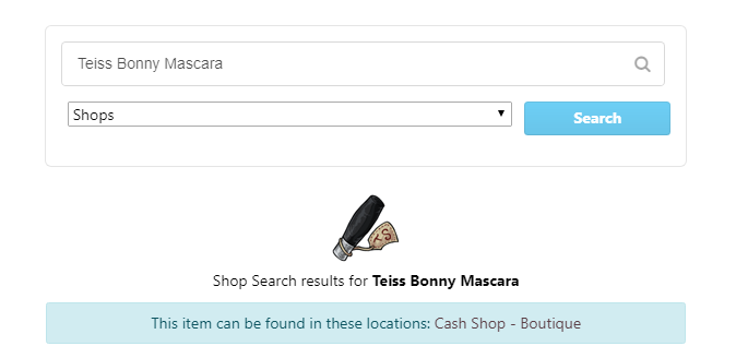 Multiple times now I've looked up items in store search and gotten the notification it's in the Cash Shop, yet when I click the link given (You know the one, the blue bar that reads "This item can be found in these locations: [Insert Place Here]") I can't find it. I don't remember the other previous items (I look up hundreds of items for fun) but right now it's Teiss Bonny Mascara