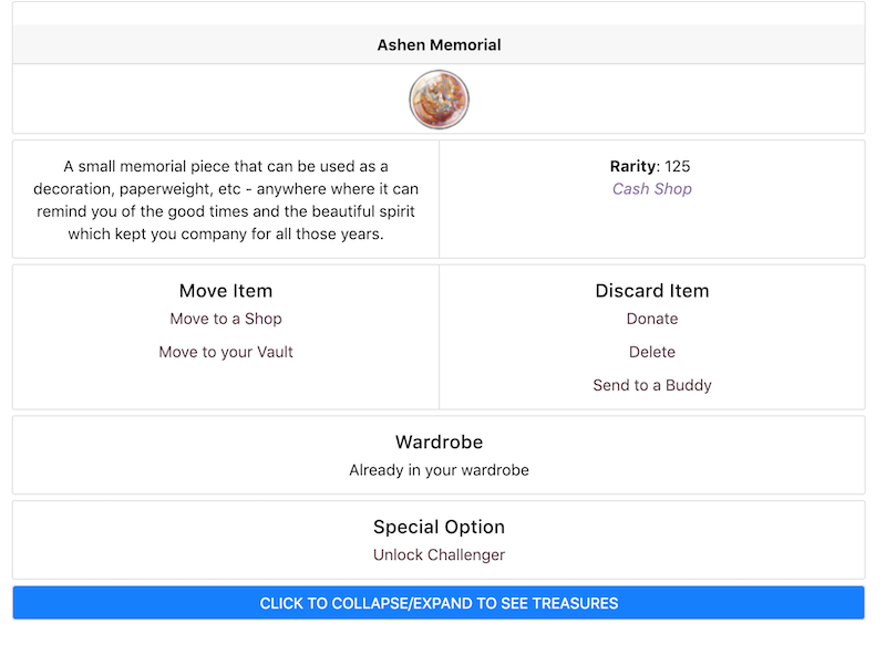 It would also be nice if the individual item pages had a wearable preview. Male & female if possible? or at least a mention if the item has a gender-specific overlay like some wigs do. A link to the shop where the item restocks (if it restocks), or a link to the shop where it's usually found (token shop, cash shop, various holiday shops, etc.) Have the specific holiday currency listed for holiday items, CS items, loyalty items, token shop items, etc. A brief explanation of the rarity would also be nice! (R101 - retired, R125 - cash shop) For items that restock in several places (Reborn Potion, for example, gets dropped into the token shop as well as restocking in the apothecary), it would be good to list both restocking areas as well as their separate official prices.