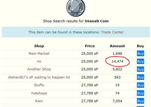 No, I get that - currently Slots sporks aren't a good example of the problem, though I've seen much bigger stacks of those. The Vesnali Coin, is - one of top three users has 14474 coins in their shop. Another person has 21,878, someone else over 7000.
