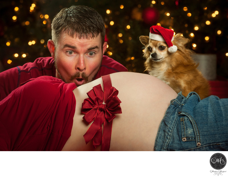 There are tons of really cute snowman maternity shirts! A cute photo in a forest looking area with it would be great! Or if it snows in your area a tiny snowman built on a small table next to you wearing the shirt!!
