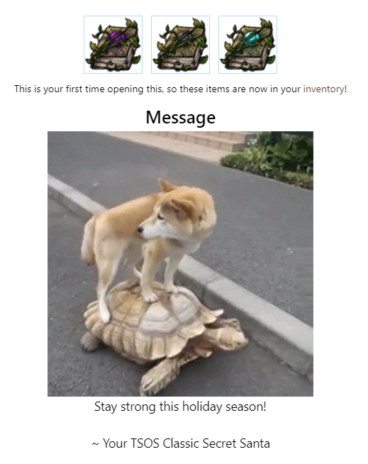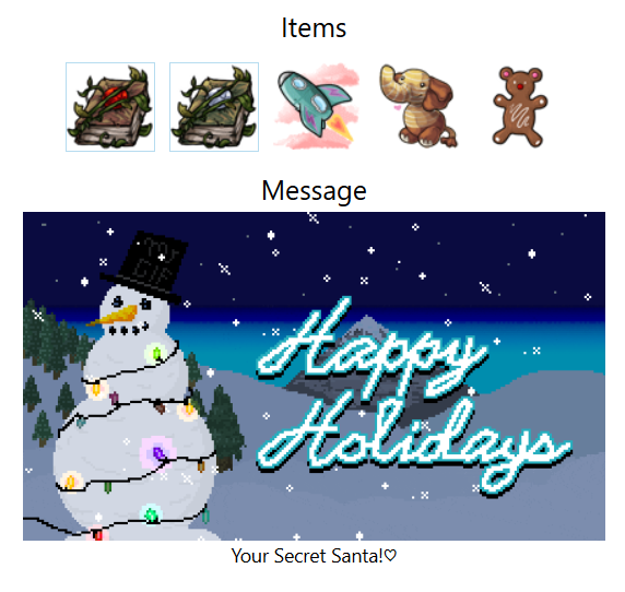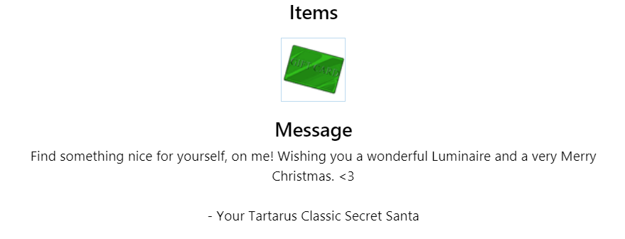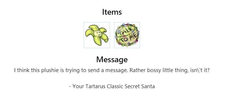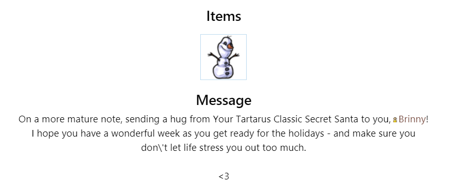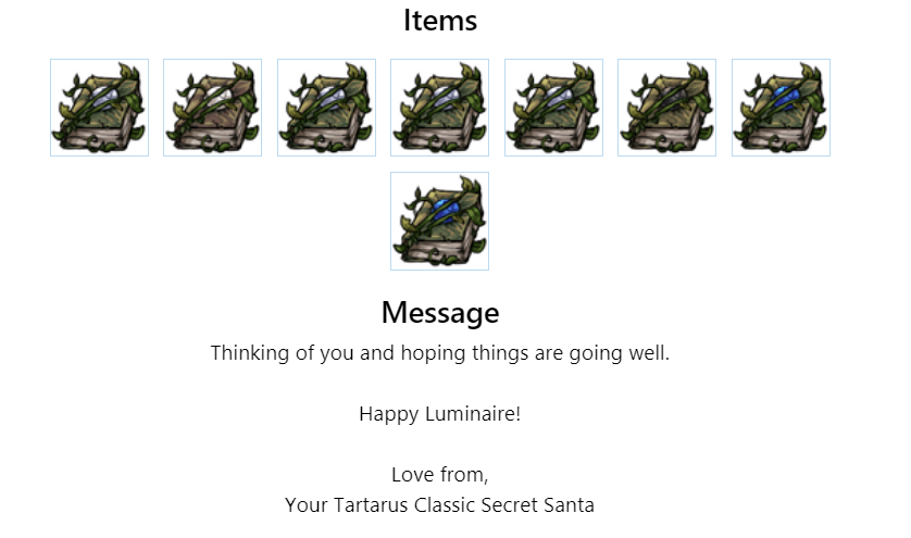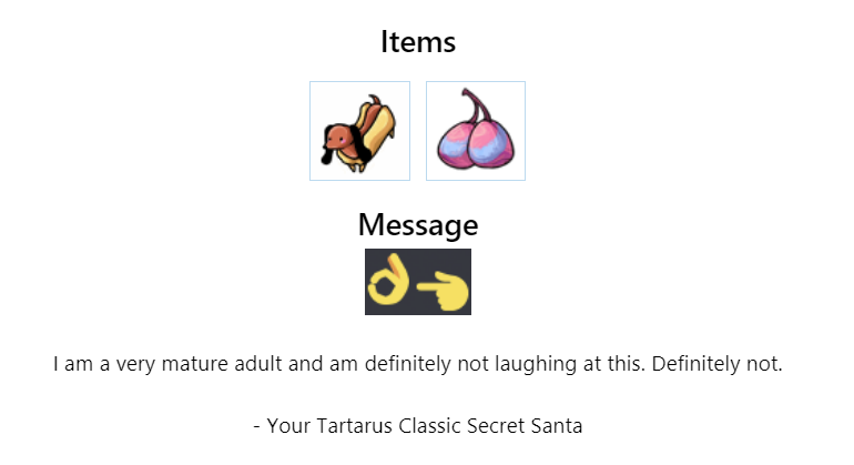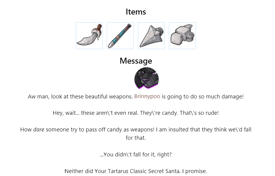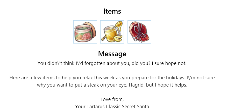I've been enjoying your gifts even if I've been too lazy and unmotivated to post here, but so you know I got them (and so discord will stop telling me I'm being a jerk), Im posting here temporarily until I get around to posting the actual messages ^_°