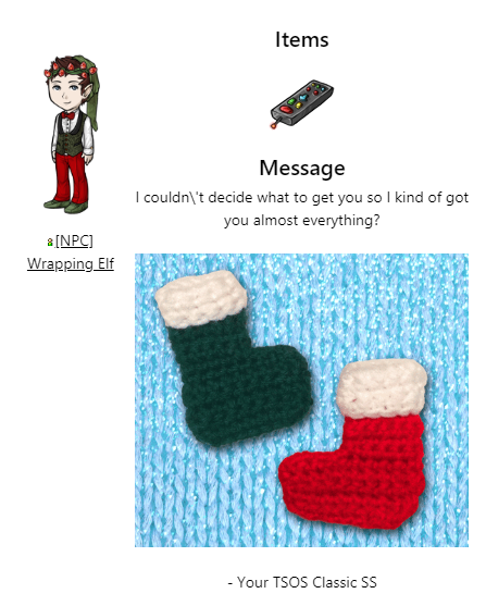 Ooh. Thank you so very much classic santa! I haven't really been stalking tique much, so that's greatly appreciated! And the baked goods will get stuffed into the appropriate pie hole. XD ....You're also quite right! ...I don't blab enough on the forums (I know, shocking, considering how much I blab elsewhere) so I'm always so short on the darn things! ❤ [edit]