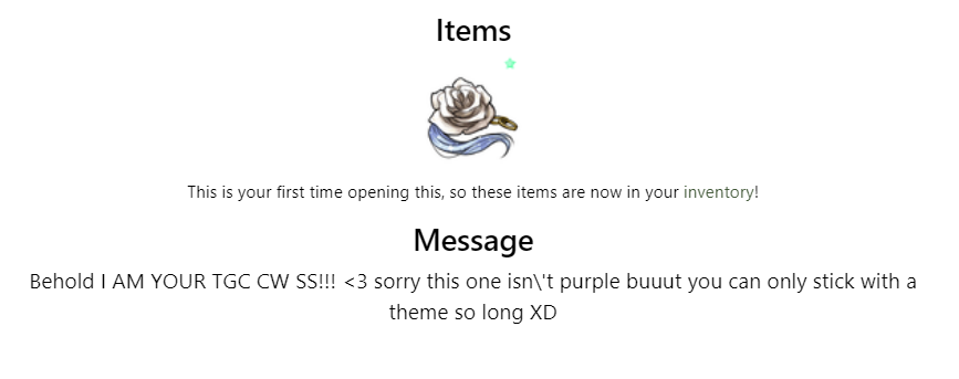 [edit] Items This is your first time opening this, so these items are now in your inventory!
