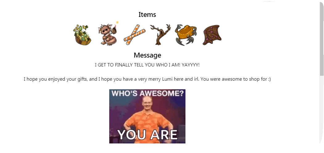 - Thank you, thank you, thank you! You have been an amazing and incredible Secret Santa. My jaw has literally hit the floor every time I have opened one of your gifts. I feel so lucky to have received your generosity! <3 <3 I hope that the rest of your Luminaire is amazing! hugs