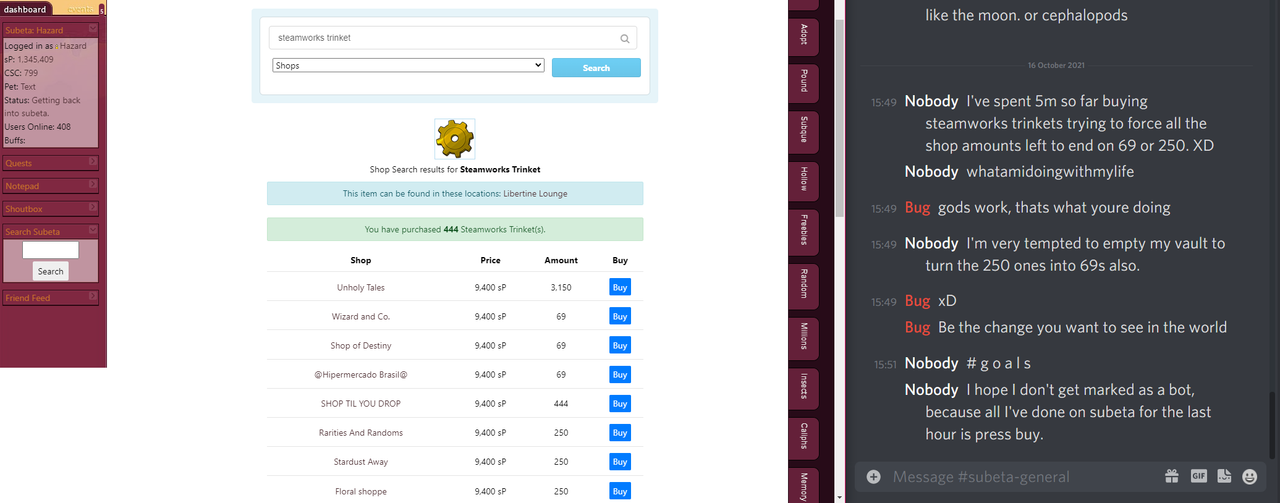 Aw, I hope you get other sweet things, too. Hehehehe. I needed around 500 steamworks tokens to buy some of my wishes! So I brought the shop amount numbers down to ones I thought were funny. By achievement, I'm not referring to a shop achievement, but, rather, that this was what I achieved for that day, the thing that I put effort into that day on subeta and was proud of! By the way, if I space out a word for dramatic effect such as in this e x a m p l e does that mess up your screen reader? I have a lot of physical disabilities so I try to think of how to make things easier on others, like not wearing perfumes in public spaces, not loitering near doors, or putting text descriptions below images.