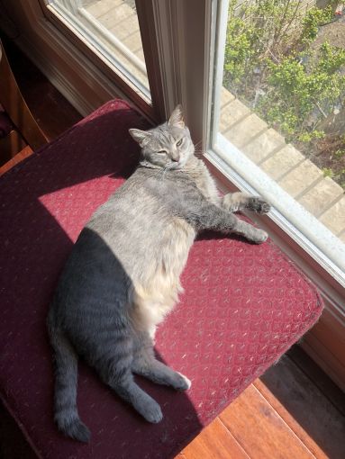 Trip is a very chonky, sleepy girl who discovered how much she loves food after coming to us skin and bones from the woods. She'd be a Snoozing for sure lol