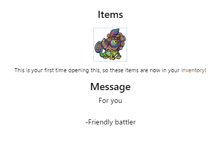 Items This is your first time opening this, so these items are now in your inventory!