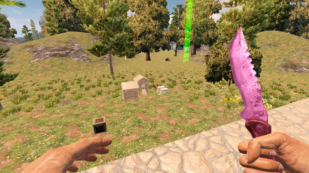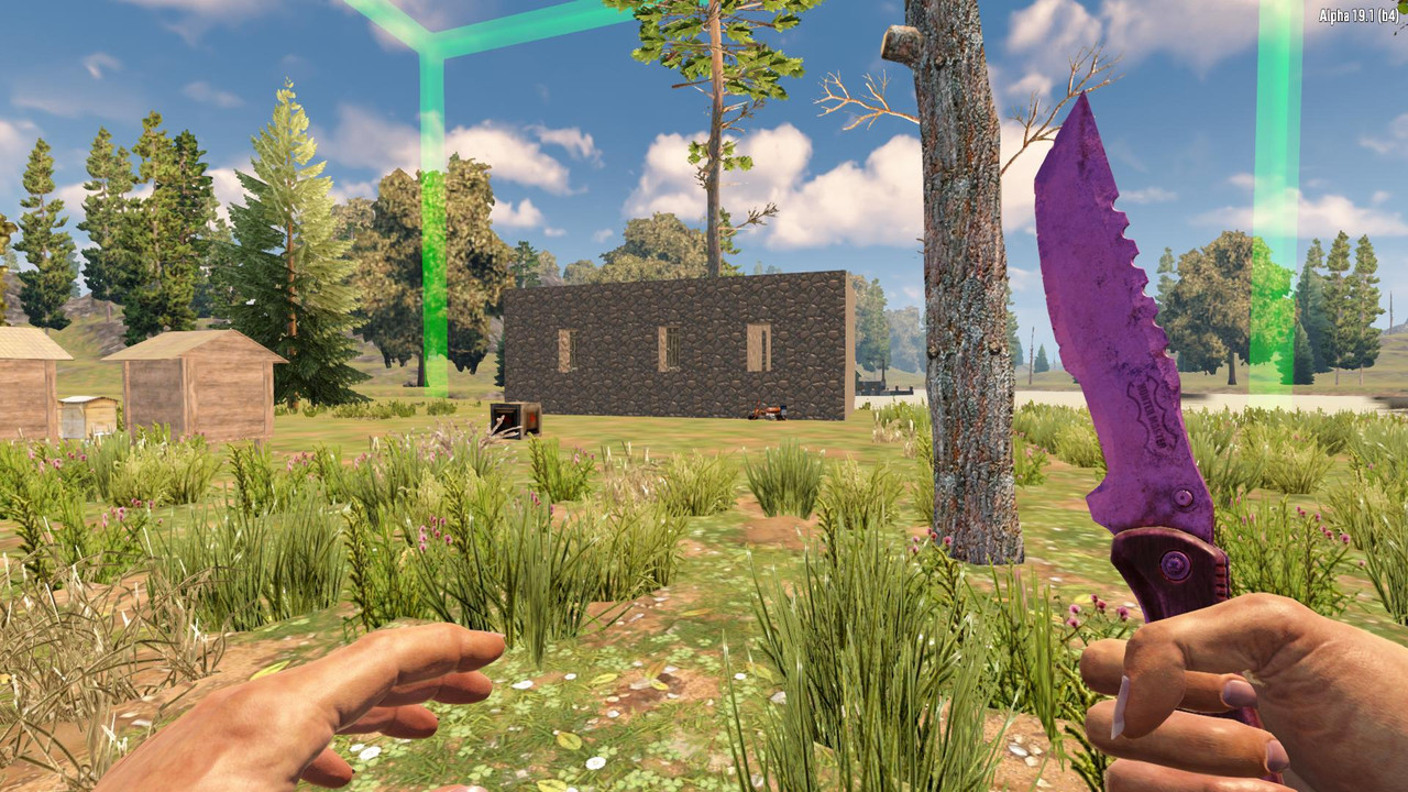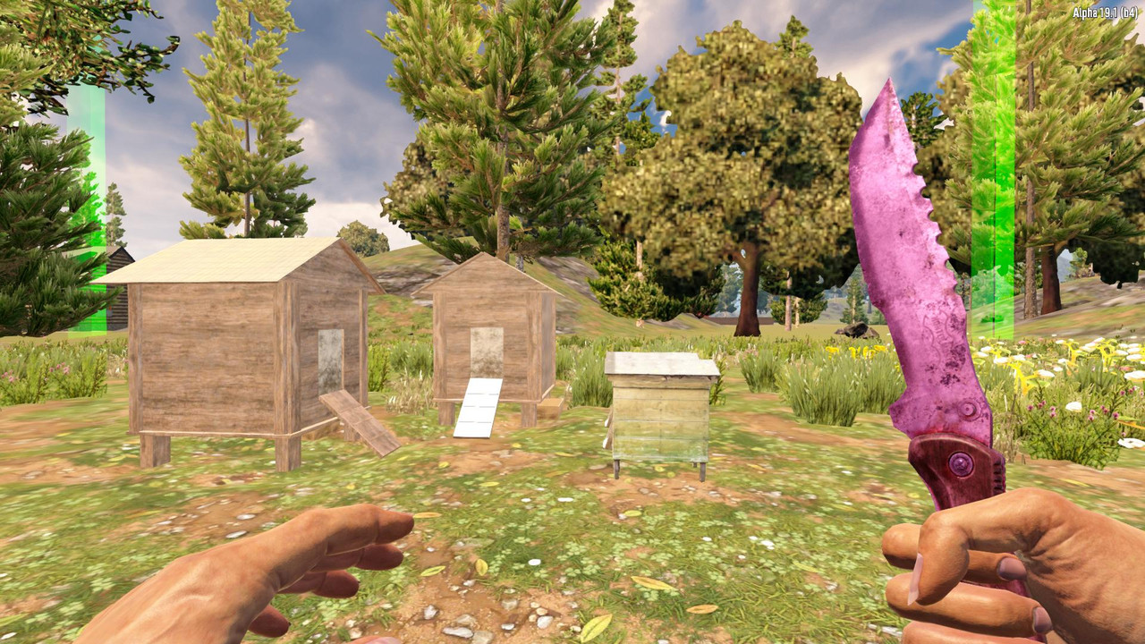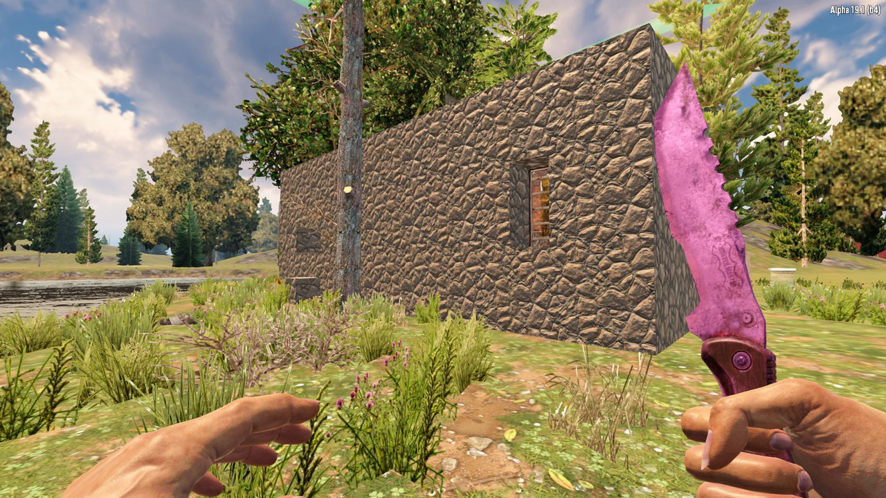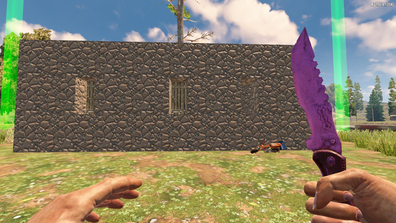 Or take the guided tour: The walk up to the front: In all its blocky glory. Close up the front, you can see the two doors, on the left is the kitchen, center is the workshop and right (where the door was attacked by a bear) bedroom. My minibike parked just under the doorway: Close up Next is the start of the farm area, chicken coops (a mod) and beehives: Farm Start I'm eventually going to plant a garden, but I haven't quite figured out where I want it exactly and I also need to gather resources for the farm plots. Also need to find books for making certain seeds, I;m still missing a couple. Next is the view of the back of the building. The door is to the kitchen, so when I need to fill water bottles, I can go straight out to the lake from the kitchen. Used a metal door for that so its bit sturdier. The excess blocks were errors. Back.