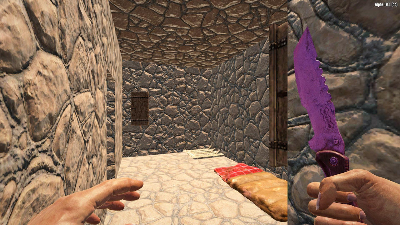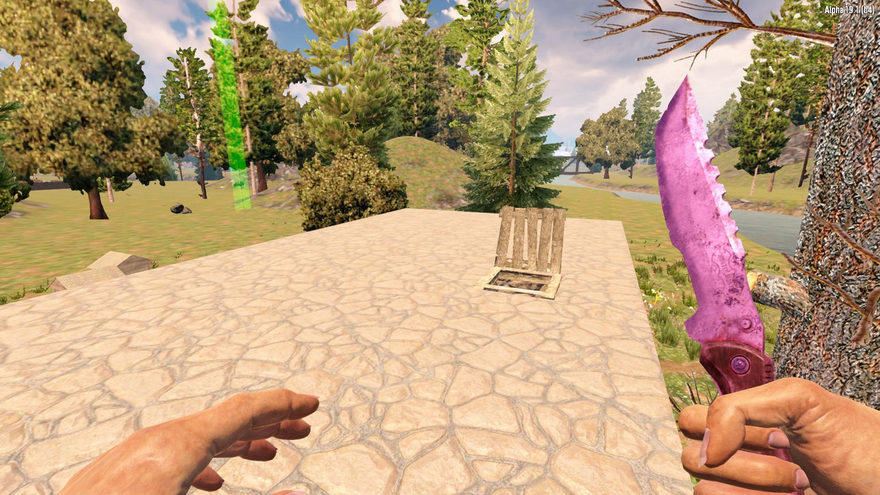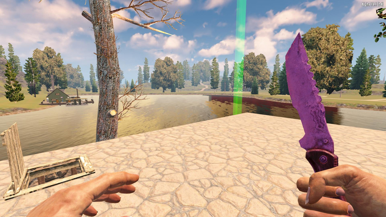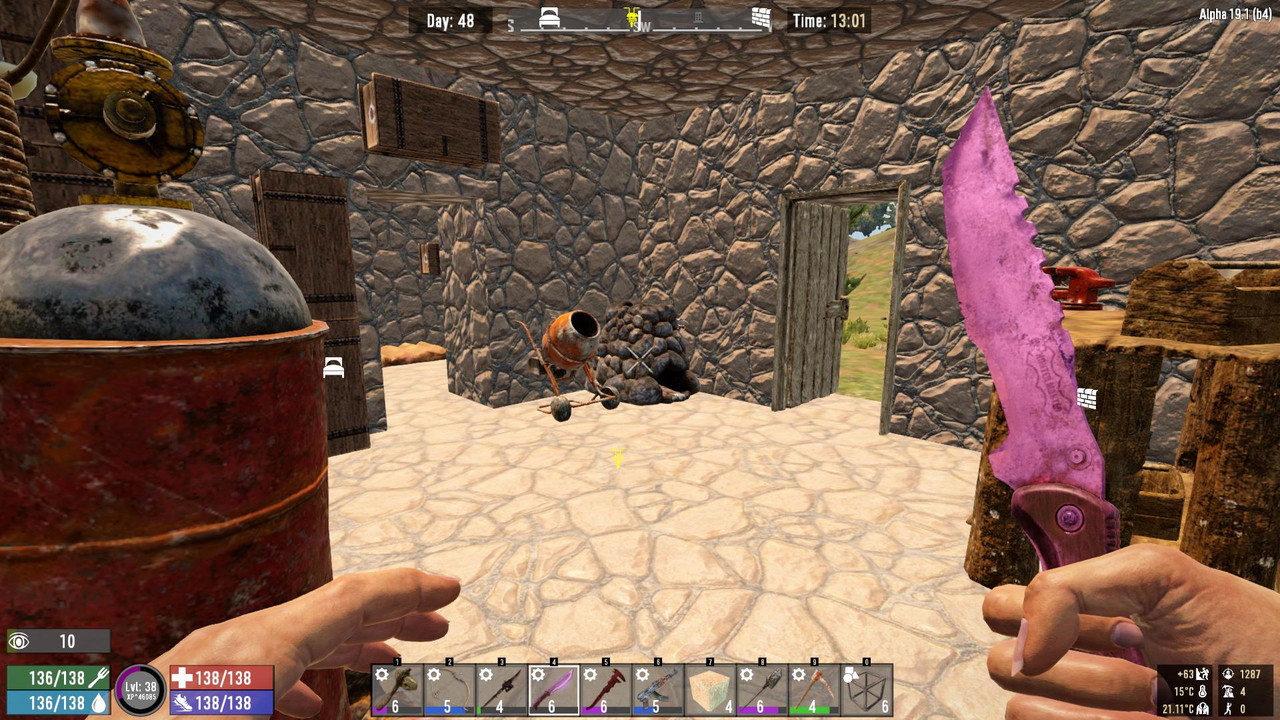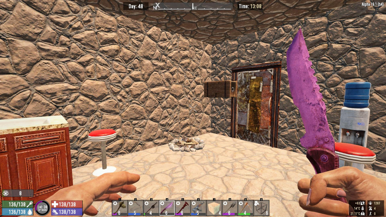 Or take the guided tour: The walk up to the front: In all its blocky glory. Close up the front, you can see the two doors, on the left is the kitchen, center is the workshop and right (where the door was attacked by a bear) bedroom. My minibike parked just under the doorway: Close up Next is the start of the farm area, chicken coops (a mod) and beehives: Farm Start I'm eventually going to plant a garden, but I haven't quite figured out where I want it exactly and I also need to gather resources for the farm plots. Also need to find books for making certain seeds, I;m still missing a couple. Next is the view of the back of the building. The door is to the kitchen, so when I need to fill water bottles, I can go straight out to the lake from the kitchen. Used a metal door for that so its bit sturdier. The excess blocks were errors. Back.