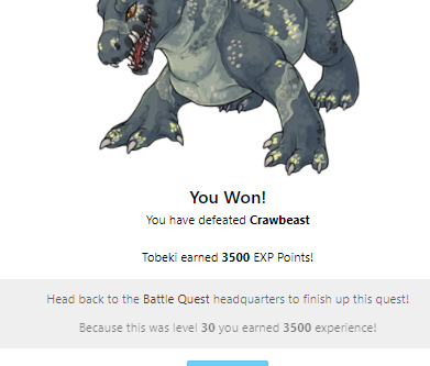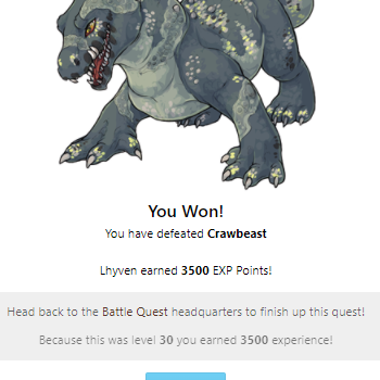 You Won! You have defeated Crawbeast Wrath earned 3500 EXP Points! Head back to the Battle Quest headquarters to finish up this quest! Because this was level 30 you earned 3500 experience!