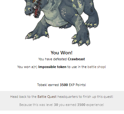 You Won! You have defeated Crawbeast Illumini earned 3500 EXP Points! Head back to the Battle Quest headquarters to finish up this quest! Because this was level 30 you earned 3500 experience!