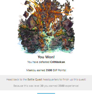You Won! You have defeated Crithbolcan You won a(n) Impossible token to use in the battle shop! Hawkeye earned 3500 EXP Points! Head back to the Battle Quest headquarters to finish up this quest! Because this was level 30 you earned 3500 experience!