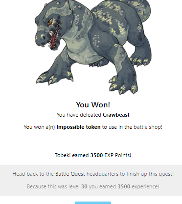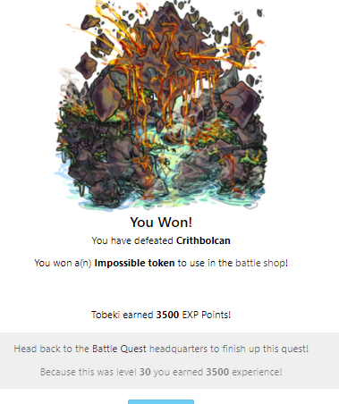 You Won! You have defeated Crithbolcan You won a(n) Impossible token to use in the battle shop!