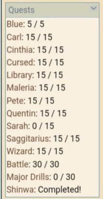 Secondly, I've seen a few who are posting incomplete entries occasionally >_< In case my first post wasn't clear every quest listed below needs to be 100% completed for your entry to count. (Wizard, Saggittarius, Quentin. Pete, Maleria, Library, Cursed, Cinthia, & Carl)