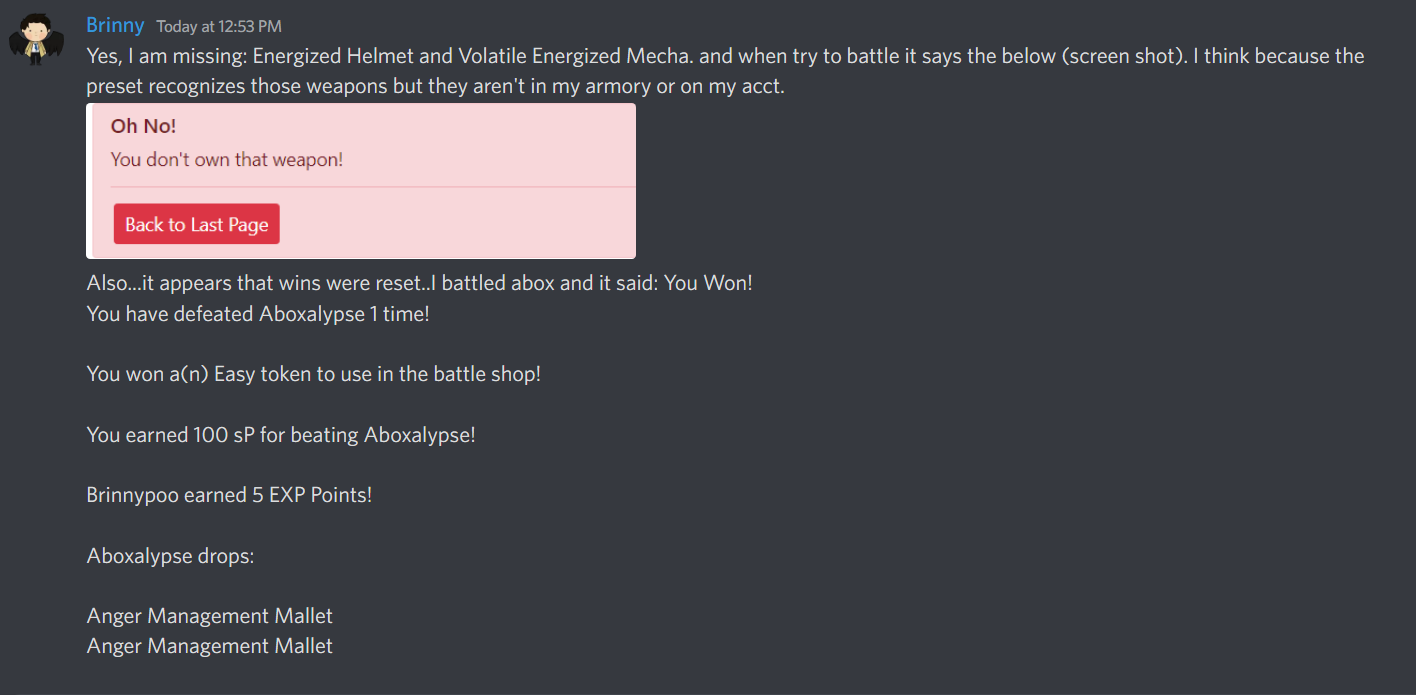 [/box]Was in the middle of BQs when this post got pushed - Aftershocks scroll is still showing up as OPB for me when it should be infinite use. Healing is still not working on weapons (seeing this specifically with Maniacal Essence, Cronus Blade, Maniacal Slappy Hand, Phoenix Quill, and Reviver of the Lion, but I assume it affects others). Assuming those issues are related to the database issue since they showed up at the same time! Sorry if this is unrelated. :P